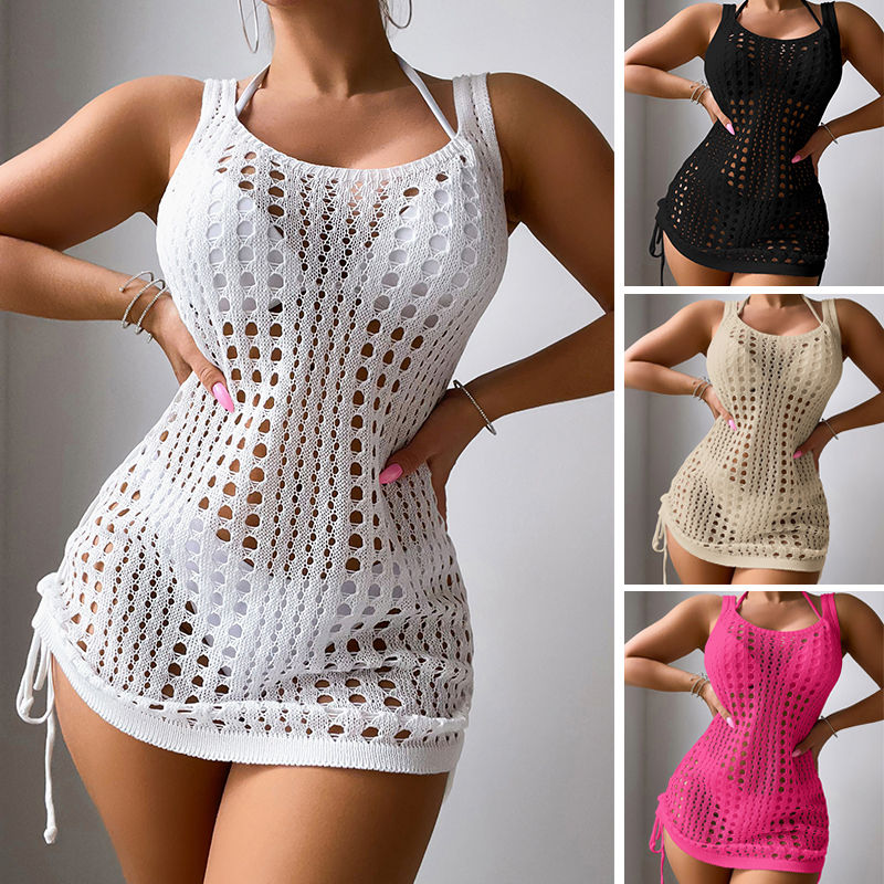 Women Knit Bathing Suit Solid Color U-Collar Sleeveless Dress Knitted Binding